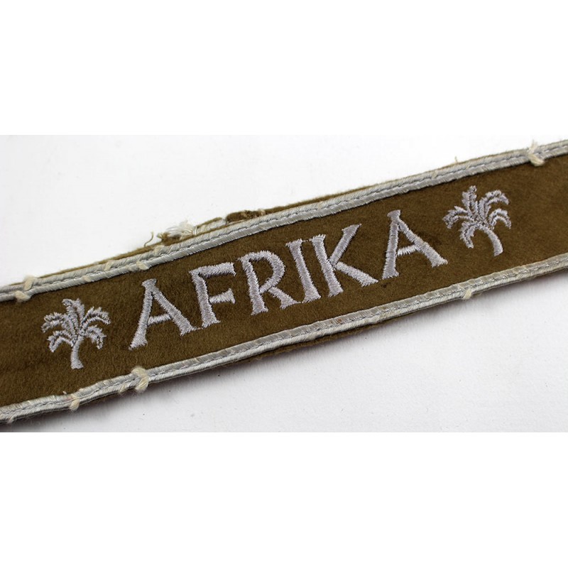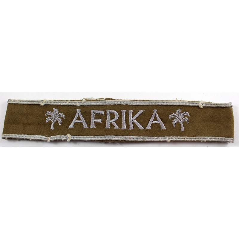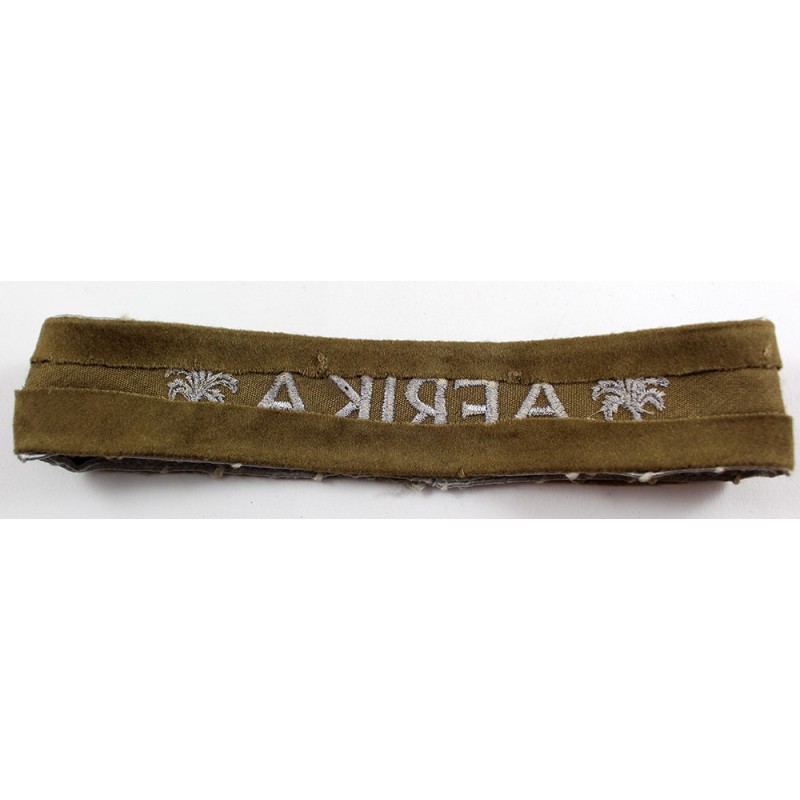 Belle bande de bras AFRIKA, démontée d’une vareuse. Fond en velours rasé, lettrage brodé coton, de belle qualité.