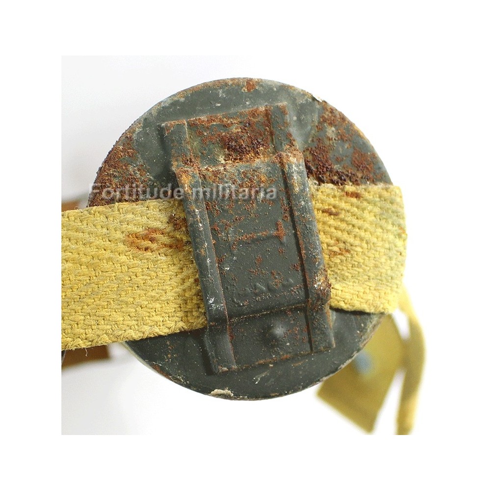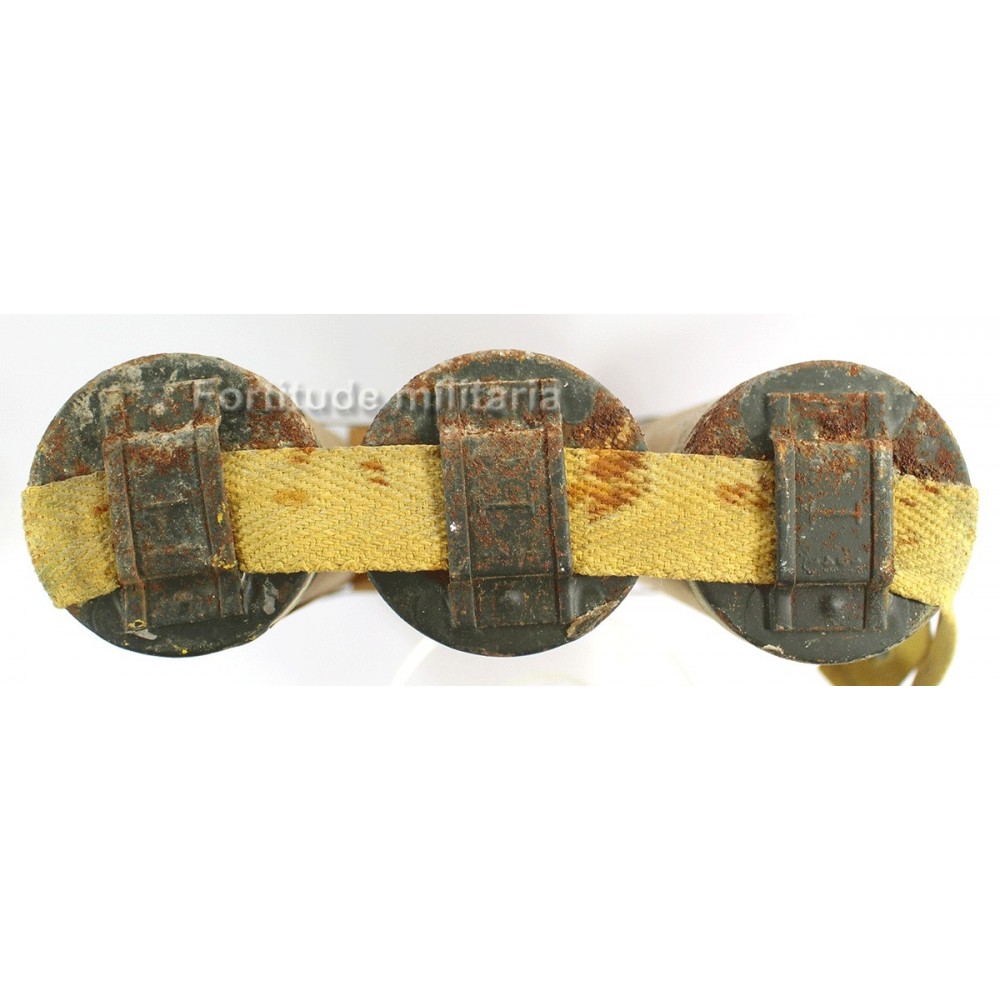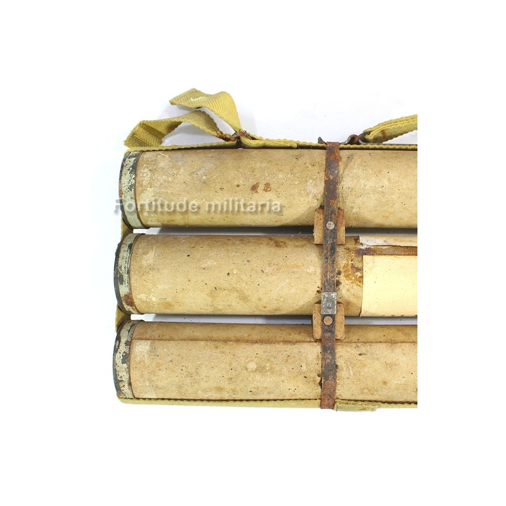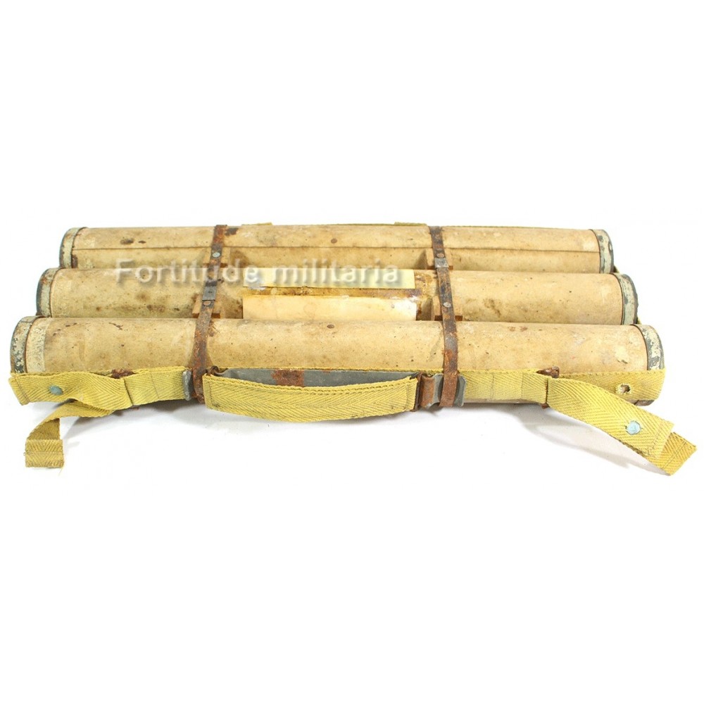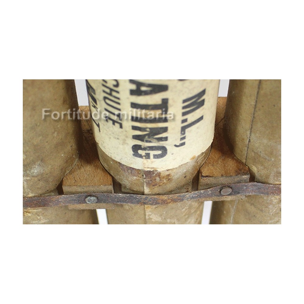 Sur le devant, on trouve la rare étiquette d'origine en papier indiquant le contenu, des obus éclairant avec un parachute pour ralentir la descente..