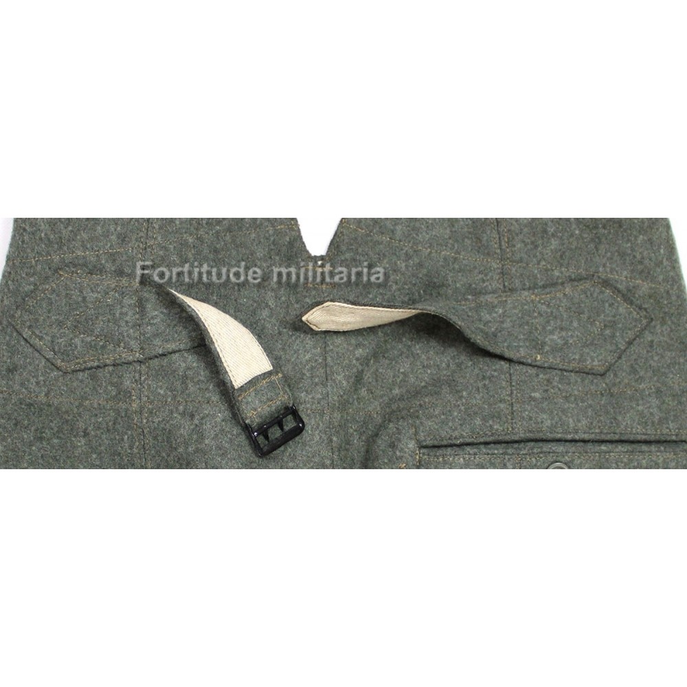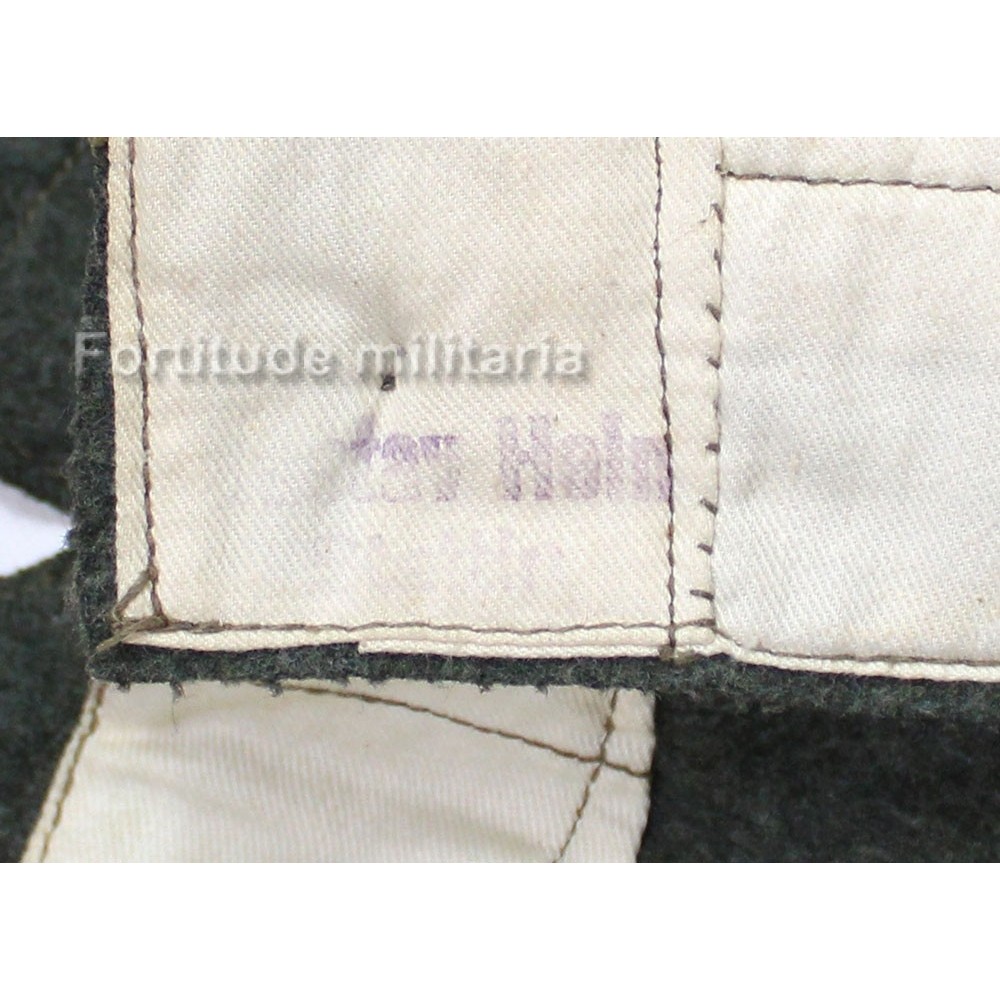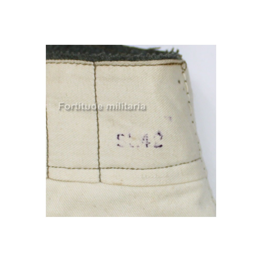 Sur la doublure en toile tramée écrue, on trouve les marquages de taille et le nom du fabriquant et l'indication " St42 " indiquant le dépôt de Stuttgart et l'année de fabrication 1942.