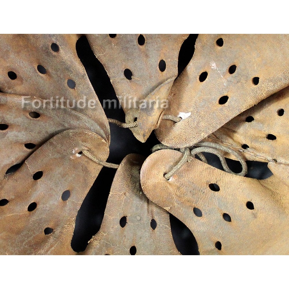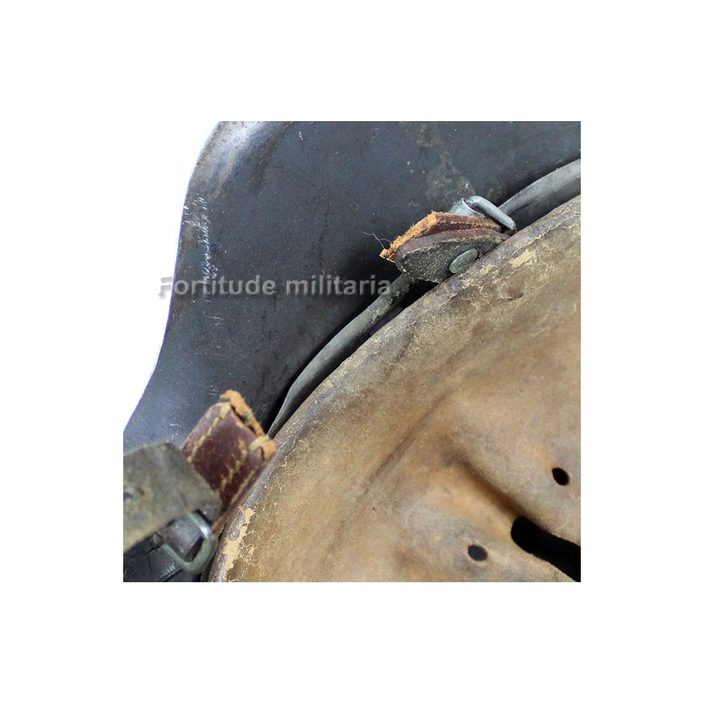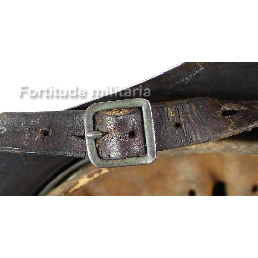 La jugulaire est présente, d'origine au casque mais malheureusement la petite patte est déchirée, nous avons choisi de la laisser en place sans la remplacer.