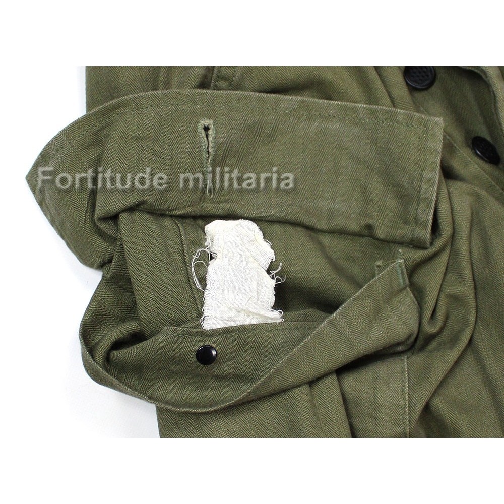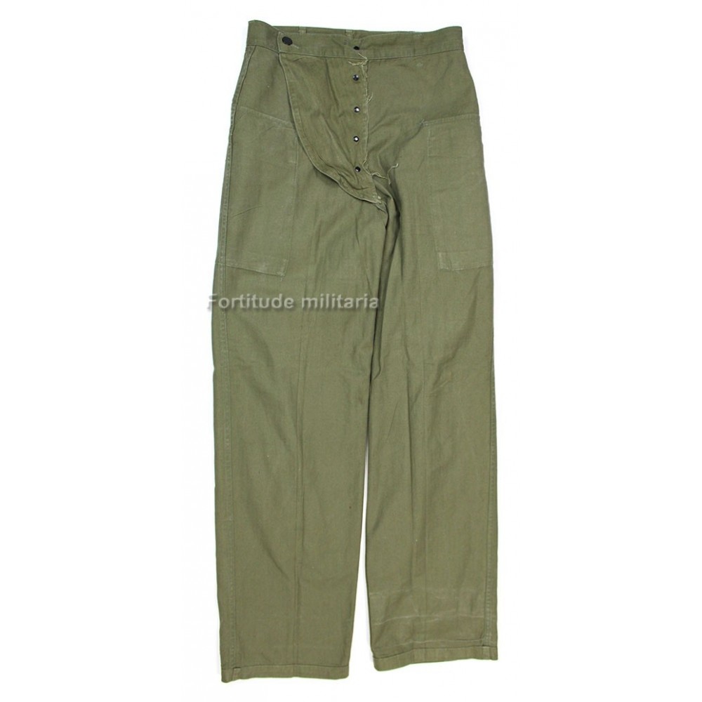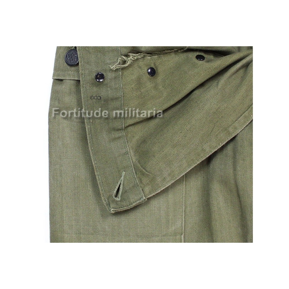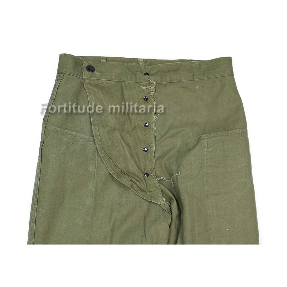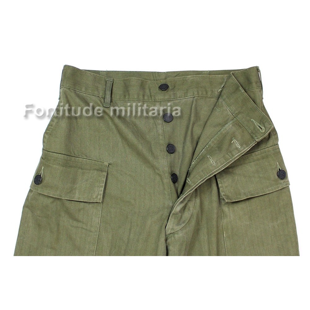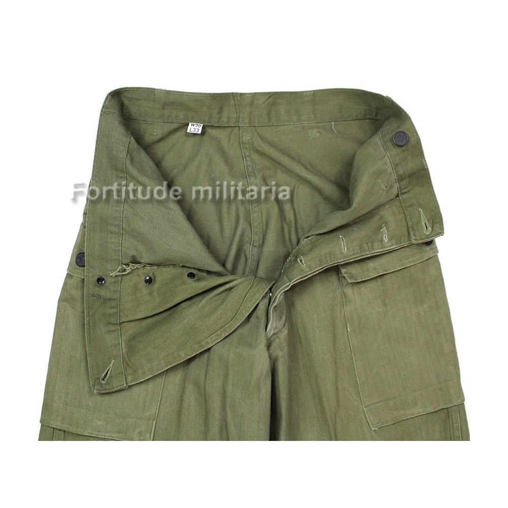 Pantalon HBT US ARMY, modèle réglementaire avec rabat anti-gaz et boutons métalliques.